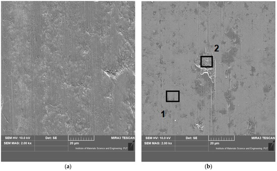 Local cavities in the wear trace, which are important for the formation of the synergy of friction and corrosion, are the result of local corrosion processes. It may be proved by the fact that such forms of damage do not occur under conditions of cathodic polarization. The surface of the wear trace following the tribocorrosion tests under cathodic polarization is shown in Figure 13. In comparison with the traces obtained at the OCP potential, there are no visible local pits (for both materials). Such pits do not form under cathodic polarization conditions. Generally, material loss occurs as a result of abrasive wear.