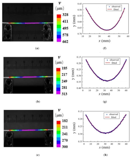 The TBC specimens were then tested under the four-point bending system. The loading P was in a range of 0–9 N to ensure the composite beam bending in elastic deformation. The moment M was calculated by . Vertical deformation of the topcoat-upward specimens under four-point bending with P = 5 N was measured by 3D DIC. In the DIC calculation, the speckle pattern of 0 N loading was set as the reference image. Figure 10a,e show the vertical deformation fields of specimens with high temperature exposure for 0, 2, 5, 10 and 20 h, respectively, and (f)–(j) are their corresponding fitting curves based on the least square method. Thus, the curvature changes of specimens under P = 5 N can be obtained. Similarly, the curvature change of the topcoat-upward specimens under various loading can be obtained.