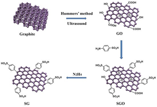 Schematic drawing of the synthesis of sulfonated graphene (SG).