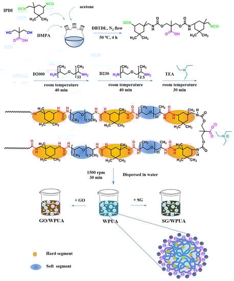 In this work, SG was prepared by covalently grafting sulfonic acid groups to the edges of graphene nanosheets. Self-emulsified WPUA was synthesized, and the polyurea chain consists of hard segment (IPDI), soft segment (D2000, D230), and anionic internal dispersant (DMPA for electrostatic stabilization). We then incorporated the SG nanosheets into the WPUA to prepare composite coating (SG/WPUA).