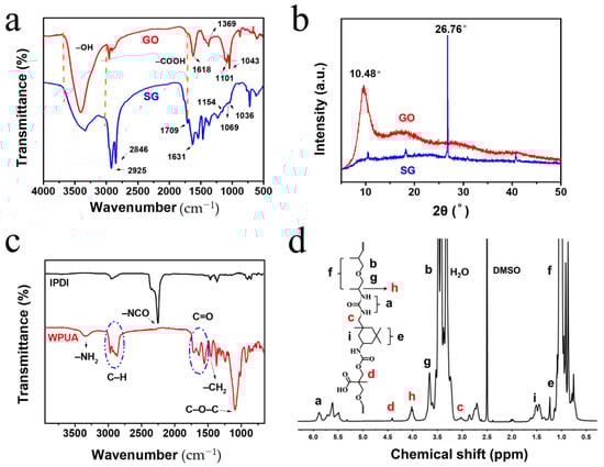 FT-IR spectra (a) and X-ray diffraction spectra (b) of GO and SG, FT-IR spectra (c), and 1H NMR spectrum (d) of WPUA.