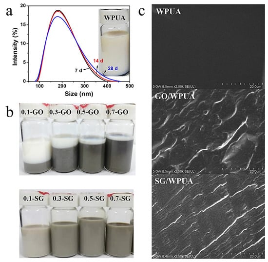 The particle size distribution of WPUA emulsion after standing for 7, 14, and 28 days (a); GO/WPUA and SG/WPUA coatings after 28 days of standing (b); SEM micrograph (c) of WPUA, GO/WPUA, and SG/WPUA with 0.3 wt.% content of filler.