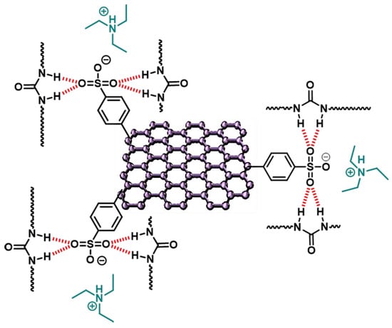 On the other hand, similar phenomena were observed in the mixture of GO and other polymers with active hydrogen groups [,,]. For example, hydroxyl-rich polyvinyl alcohol (PVA) chain can interact with two or more GO sheets by hydrogen bonds, forming a sufficient number of cross-linking sites, GO composite hydrogel is generated due to the formation of a GO network []. In the externally emulsified epoxy emulsion (WPE), hydrogen bonds are formed between GO and the surfactant, leading to the gelation and demulsification of the epoxy emulsions []. The mechanism is explained as follows: plenty of oxygen-containing groups on the surface of the GO sheets, forming hydrogen bonds with the urea groups on the polyurea chain. When the hydrophilic structure on the polyurea chain is insufficient to support the stable suspension of the two in water, this will cause the sedimentation of GO and part of the polyurea nanoparticles. There are fewer hydrogen bonds between SG and polyurea, which is beneficial to the storage stability of WPUA emulsion. In Figure 5, the dissociation mechanism of sulfonic acid groups on SG nanosheets in WPUA emulsion can be seen. The WPUA form hydrogen bonds with sulfonic acid groups (O=S=O) of SG nanosheets, rather than the ionic bond. In addition, the sulfonic acid groups (S–O−) form ionic bond with TEA (neutralizer in WPUA emulsion).