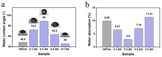 Figure 6a,b exhibit the water contact angle and water absorption for composite films with different contents of SG sheets. The water contact angle increases first and then decreases as the content of SG increases, while the water absorption decreased first and then increased. These phenomena suggest that the barrier properties of WPUA nanocomposite film were enhanced with the incorporation of SG nanosheets. The addition of a small amount (≤0.3 wt.%) of SG can enhance the hydrophobicity of the composite film. However, when the SG content increased to 0.7 wt.%, the performance decreased, which may be attributed to the weakened phase compatibility and increased phase aggregation.