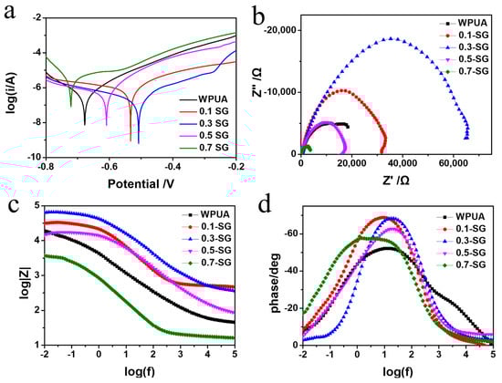 As can be seen from Figure 8b, the diameters of these semicircles vary with different additives in Nyquist plots. It can also be found that the addition of 0.1 wt.% and 0.3 wt.% SG nanosheets increases the diameter of the semicircle significantly, indicating that SG nanosheets can improve corrosion protective performance of pure water-borne polyurea resin coating.