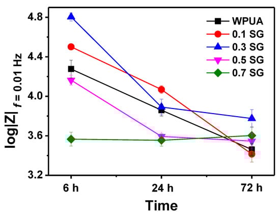 To further investigate the effects of different immersion times (6, 24, and 72 h, respectively) on the corrosion protective performance of composite coatings with different content of SG nanofiller, the Bode impedance plots were further analyzed. The impedance modulus |Z| at the lowest frequency (f = 0.01 Hz) in the Bode impedance curve represents the ability of the coating to impede the flow of current between the cathode and anode. |Z|f = 0.01 Hz can be regarded as a semi-quantitative index of corrosion resistance to evaluate the protective performance of the coating. The log|Z|f = 0.01 Hz-timeline is shown in Figure 9. The |Z|f = 0.01 Hz value of WPUA coating was about 1.9 × 104 Ω·cm2 at 6 h immersion, with the prolongation of the exposure time, the |Z| value of the WPUA coating dropped to 1.4 × 103 Ω·cm2 at 136 h. It demonstrates that the WPUA coating has poor barrier properties to corrosive electrolytes. For 0.3-SG samples, the value of |Z|f = 0.01 Hz has a range of 6.4 × 104 to 2.2 × 104 Ω·cm2, which was higher than that of the WPUA samples during the whole immersion process. Its remarkable protective performance is attributed to 0.3 wt.% of SG nanosheets, which are uniformly dispersed in polyurea resin and can resist the diffusion of corrosive electrolyte.