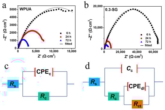 Nyquist plots of WPUA (a) and 0.3-SG (b); electrical equivalent circuit diagrams fitting Nyquist plots for immerse to 6 h (c), 24 h, and 72 h (d).