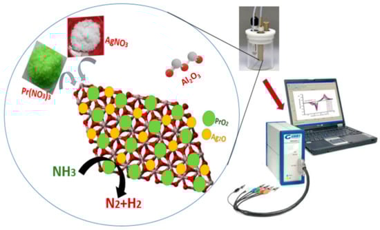 Chemicals used for synthesis were bought from Sigma Aldrich (St. Louis, MO, USA). The chemicals used for the present work are aluminum nitrate (Al(NO3)3·9H2O), ammonia solution (NH3), praseodymium nitrate hexahydrate (Pr(NO3)3·6H2O), silver nitrate (AgNO3), potassium hydroxide (KOH), sulfur acid (H2SO4), potassium hexacyanoferrate (III) (K4[Fe(CN)6]), alumina powder and Nafion.