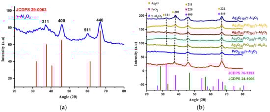 X-ray diffraction peaks of (a) γ-Al2O3 with Joint Committee on Powder Diffraction Standards (JCPDS) card numbers. (b) Overlay of XRD peaks of γ-Al2O3 and Ag2O(X)–PrO2(Y)/γ-Al2O3, along with JCPDS card numbers.