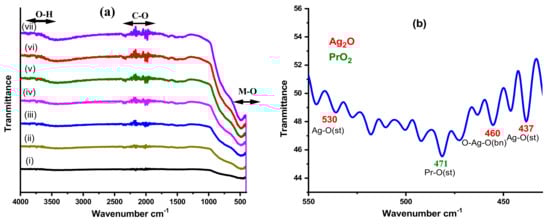 The Fourier-transform infrared spectroscopy (FTIR) spectra for γ-Al2O3 and all synthesized nanocomposites inserted in KBr powder system were investigated in wavelength range (400–4000) cm−1 by using Nicolet 5PC, Nicolet Analytical Instrument (Protea, Cambridgeshire, UK, Figure 3). The vibration bands observed in the range of (3500–4000) cm−1 correspond to O–H stretching vibrations. These bands appeared because of moisture absorbed by the samples []. C–O vibration bands due to adsorbed CO2 also appeared in the range of (1500–2500) cm−1 []. The metal oxides vibration bands are seen between 300 and 700 cm−1 []. The bands in Figure 3b represent the stretching and bending vibration modes of Ag2O [] and stretching vibration bands of PrO2 [].