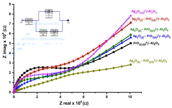 Nyquist plots of Ag2O(x)–PrO2(y)/γ-Al2O3 modified electrodes recorded in 5 mM K4[Fe(CN)6] + 3 M KCl. Inset represents the equivalent circuit.