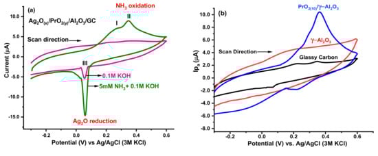 The cyclic voltammetric response of bare glassy carbon and γ-Al2O3/GC with (red curve) and without (black curve) Ag2O–PrO2 loadings was studied in a 5 mM NH3 + 0.1 M KOH system, as shown in Figure 7b,c. The electrochemical oxidation of ammonia in KOH is not observed on bare glassy carbon and γ-Al2O3/GC, while the peak appeared on Ag2O(x)–PrO2(y)/γ-Al2O3/GC, confirming the electrocatalytic response of Ag2O–PrO2/γ-Al2O3 towards the electrochemical oxidation of ammonia, as elucidated by Figure 7b,c.