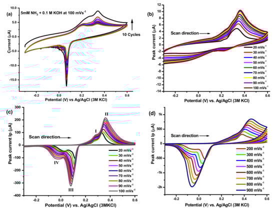As-synthesized nanocomposites Ag2O(x)–PrO2(y)/γ-Al2O3 were investigated to check their activities towards the oxidation of NH3 in alkaline medium. The potential window for ammonia oxidation was from −0.3 to 0.6 mV, in forward and reverse scan. When ammonia oxidation was carried out on modified electrodes at room temperature, two anodic peaks were observed which are related to adsorption/oxidation of ammonia in positive going scan (I and II) Figure 7a. A strong cathodic peak (III) is observed at around 0.05 volts, in the absence (pink curve) and presence (green curve) of ammonia, which is the reduction peak of silver oxide converted into metallic silver [,]. An anodic shoulder peak (I) appearing at 0.23–0.27 V is due to the oxidation of pre-adsorbed hydrogen/nitrogen-containing intermediates species at the surface of modified electrode, which shows the structural sensitivity of nanocatalysts for these adsorbed species [,]. There is appearance of cathodic shoulder peak (IV) in ammonia oxidation catalyzed on the surface of higher members of synthesized series (Figure 8c,d), which is due to desorption of hydrogen on the surface []. With higher scan rates, the anodic and cathodic shoulder peaks diminished. The onset potential for ammonia oxidation is 0.03 V vs. Ag/AgCl (i.e., 0.023 V vs. NHE approximately) on the surface of modified electrodes and the oxidation peak appear in the range of 0.32–0.51 volts, which is a low input potential range, as compared to reported systems illustrated in Table 4, in the same medium.