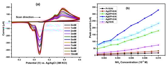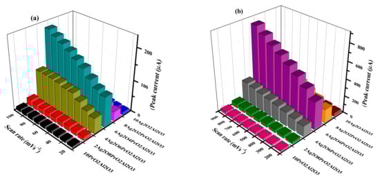 where, A is ECSA (cm2); Ip is peak current (µA); n represents the number of electrons transferred (1 in this case); Do is the diffusion co-efficient, which is 0.76 × 10−5 cm2·s−1 at standard temperature and pressure (S.T.P); and C is the concentration of K4[Fe(CN)6]. Corresponding ECSA values are calculated from slope, and the comparative ECSA for the whole series is presented in Figure 5b. The Ag2O(6)–PrO2(4)/γ-Al2O3 modified electrode has a greater ECSA value, as compared to other modified electrodes, which means this composition provides greater surface area to catalyze the respective reaction on its surface and facilitates the reaction more efficiently.