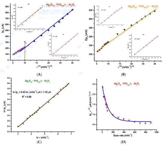 Electrochemical active surface area (ECSA) of Ag2O–PrO2/γ-Al2O3 samples was estimated by cyclic voltammetric profile, using a redox couple having 5 mM potassium ferrocyanide in 3 M KCl, as shown in Figure 5a. The peak current responses at various scan rates are plotted against ν1/2, applying the Randles–Ševčík equation []: