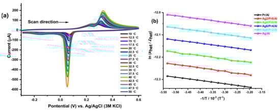 Cyclic voltammograms were observed by varying the temperature of the system from 10 to 50 °C with the Ag2O(6)–PrO2(4)/γ-Al2O3 catalyst, as shown in Figure 12a. The observed thermodynamic parameters tabulated below show that electro-oxidation of ammonia in alkaline solution is exothermic and non-spontaneous reaction. The entropy of ammonia electro-oxidation is negative because it is an adsorption-controlled process. Before adsorption, the molecules are free to move in three dimensions; when these get adsorbed on the surface of catalyst, their motion is restricted. As a result, disorderliness decreases, and entropy of the system decreases. The free energy of activation is less for Ag2O(6)–PrO2(4)/γ-Al2O3 modified electrode, which reveals that this composition exhibits superior catalytic properties among this series because it lowers the activation energy of system to a greater extent.
