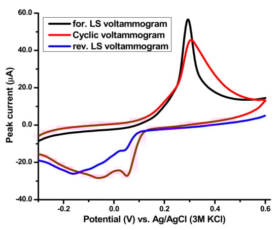 The independent behavior of cathodic and anodic reactions was further confirmed by comparing the linear-sweep voltammograms (LSV) with cyclic voltammogram (CV) observed for 5 mM NH3 in 0.1 M KOH at 100 mV·s−1, as represented in Figure 13. It reveals that the anodic peak (black curve) is purely for ammonia oxidation, and the cathodic peak (blue curve) is for the reduction of silver oxide into metal silver. The comparison of LSV with CV will help to propose a mechanism for ammonia oxidation on surface of electrocatalysts.