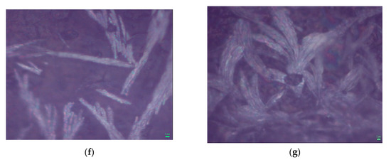 As shown in our previous article [13], the RGO Raman spectrum at an excitation wavelength of 514 nm is characterized by two lines at 1349 and 1573 cm−1, these being assigned to the graphitic lattice defects and E2g in-plane phonon in the Brillouin zone G point [14]. According to our previous studies, the main Raman lines of PDPA in a doped state were reported to be localized at 1176, 1342, 1367, 1492, 1585, and 1613 cm−1, these being assigned to the vibrational modes C–H bending in the benzene ring, C–N in the N,N’-diphenyl benzidine radical cation, C=N stretching, C–C stretching in the quinoid ring + C–C stretching in the benzene ring, and C–C stretching in benzene ring + C–H bending in benzene ring, respectively [15,16]. The Raman line at 1592 cm−1 in Figure 1a, confirms the presence of PDPA on the RGO sheet’s surface. The Raman line at 996 cm−1 (Figure 1a) belongs to the vibrational modes of W=O in the H4SiW12O40 [17]. The up-shift of the Raman line assigned to the C–H bending vibrational mode in the benzene rings of the polymer from 1176 to 1189 cm−1 can be explained if we accept that a covalent functionalization process of the RGO sheets with conjugated polymer takes place, when the steric hindrance effects are induced in the PDPA macromolecular chain. A puzzling fact is the presence of the Raman line at 1133 cm−1 (Figure 1a), which is located not far from the Raman line from 1150 cm−1 assigned to the vibrational mode of C–H in-plane bending of the polymers having triphenylamine as repeating units [18]. The Raman spectrum of PDITC, at the excitation wavelength of 514 nm, shows lines with peaks at 1157, 1257, 1583, and 1603 cm−1, attributed to the vibrational modes of the C–S bending, C–H in the benzene ring + C–C stretching + C–N stretching, C=C+C–C stretching in the benzene ring, and C–C stretching + C–H bending in the benzene ring, respectively [19,20,21,22,23]. The interaction of the SPCE-RGO/PDPA with the PDITC solutions with increasing concentration leads to the following changes in the Raman spectra of Figure 1: (i) an up-shift of the Raman lines from 1592 and 1189 cm−1 to 1601 and 1196 cm−1, respectively; (ii) a down-shift of the Raman line from 1350 to 1320 cm−1; (iii) as the PDITC concentration increases from 0.5 to 4 mg mL−1, a change in the values between the Raman lines peaked at 1157 and 1195–1196 cm−1, respectively, (I1157/I1193–1196) as well as those at 1255 and 1320 cm−1 (I1255/I1320) vary from 0.26 and 0.41 (Figure 1b) to 4.27 and 5 (Figure 1e), respectively. These changes indicate a chemical interaction of SPCE-RGO/PDPA with PDITC, which, according to Figure 1f,g, involve the appearance of one-dimensional structures.