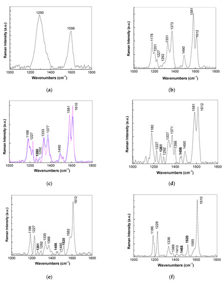 (c) the interaction of the SPCE-RGO/PDPA platform with PDITC leads to: (c1) a gradual increase in the intensity of the Raman lines peaked at 1227 and 1610 cm−1 simultaneously with an up-shift of the Raman line from 1178 to 1186 cm−1, (c2) the change in the ratio between the intensities of the Raman lines at 1178–1186 and 1227 cm−1 (I1178–1186/I1227) from 3.19 (Figure 2b) to 1.14 (magenta curve in Figure 2c) as well as those at 1581 and 1612–1610 cm−1 (I1581/I1612–1610) from 1.75 (Figure 2b) to 0.84 (magenta curve in Figure 2c), and (c3) the appearance of the Raman line at 1260 cm−1; all these changes indicate a chemical adsorption of PDITC on the surface of the SPCE-RGO/PDPA platform, which will be labeled in the following as the SPCE-RGO/PDPA-PDITC platform;
