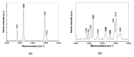 (b) after the recording of 20 cyclic voltammograms onto the SPCE-RGO surface, the SPCE-RGO/PDPA platform is characterized by the intense Raman lines peaking at 1178, 1331, 1373, 1490, 1581, and 1612 cm−1 belonging to PDPA doped with the H4SiW12O40 heteropolyanions and two Raman lines of low intensity at 1227 and 1292 cm−1 belonging to the vibrational mode of the C–N stretching of PDPA and the D band of the RGO sheets (Figure 2b);