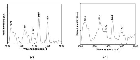 (d) the interaction of the SPCE-RGO/PDPA-PDITC platform with protein G induces in the Raman spectrum shown in Figure 2d the appearance of a new line at 1456 cm−1 simultaneously with an up-shift of the Raman line assigned to the vibrational mode of C–N in the N,N’-diphenyl benzidine radical cation, from 1331 to 1337 cm−1;