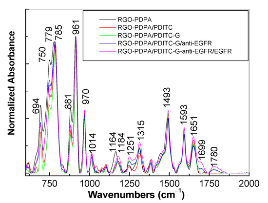 Additional information is obtained by FTIR spectroscopy, as shown in Figure 4. The main IR bands of the SPCE-RGO/PDPA platform peak at 694, 750, 779, 881, 916, 970, 1014, 1164, 1251, 1315, 1493, 1593, and 1651 cm−1, being assigned to the following vibrational modes: inter-ring deformation, ring deformation, W–Oc–W (octahedral edge-sharing), C–H in-plane bending of the quinoid ring (Q), W–Ob–W (octahedral corner-sharing), W–Od (terminal), Si–Oa, C–H bending in the benzene ring (B) + quinoid ring (Q), radical cation structure, Caromatic–N stretching, C–C stretching + C–H bending, C–C stretching, and –NH+=Q=Q=NH+–, respectively [19,25,26,27]. The interaction of the SPCE-RGO/PDPA platform with PDITC, protein G, EGFR antibodies, and EGFR antigen induces in Figure 4 the following changes: (i) a decrease in the absorbance of the IR bands at 694 and 750 cm−1; (ii) an up-shift of IR band from 1164 to 1184 cm−1; (iii) a gradual increase in the absorbance of the IR bands at 1251, 1315, 1593, and 1651 cm−1; and (iv) the appearance of two IR bands with maxima at 1699 and 1780 cm−1, both assigned to the C=O vibrational mode whose absorbance gradually increases as the platform interacts with protein G, EGFR antibodies, and EGFR antigen.