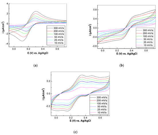 Figure 6a–c show the fifth cyclic voltammogram of the Au electrode, SPCE-RGO and SPCE-RGO/PDPA-PDITC-G-anti-EGFR/EGFR in 5 mM K3[Fe(CN)6]/K4[Fe(CN)6] solution, depending on the scan rate. The main changes in the potential of the anodic and cathodic peaks as well as their current densities are summarized in Table 1.