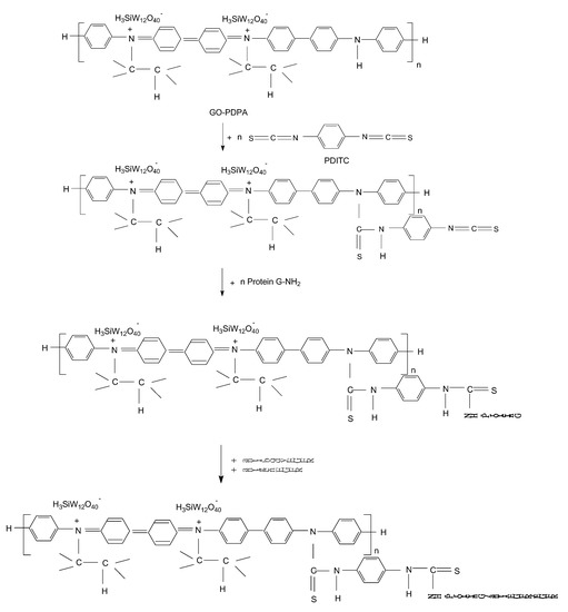 The interaction of SPCE-RGO/PDPA with PDITC followed of the chemical interaction with protein G, EGFR antibodies, and EGFR.
