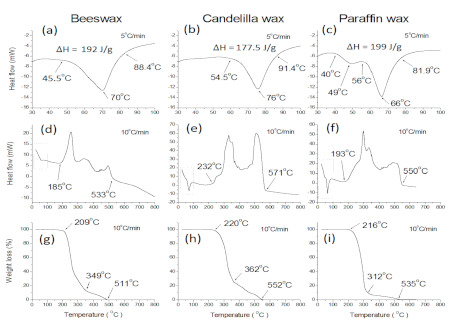 Above: DSC plots in a range temperature from room temperature to 100 °C for (a) beeswax, BW, (b) candelilla wax, CW, (c) paraffin wax, PW, heat rate at 5 °C/min. Middle: DSC plots in a range temperature from room temperature to 800 °C for (d) beeswax, BW, (e) candelilla wax, CW, (f) paraffin wax, PW, heat rate at 10 °C/min. Bottom: TGA plots in a range temperature from room temperature to 800 °C for (g) beeswax, BW, (h) candelilla wax, CW, (i) paraffin wax, PW, heat rate at 10 °C/min.