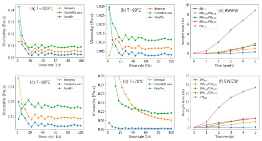 Viscosity of waxes at (a) 100 °C, (b) 90 °C, (c) 80 °C, (d) 70 °C; and weight loss of cheese coated with (e) PWx/BW1−x blend (x = 1.0, 0.75, 0.50, 0.25, 0) and (f) CWx/BW1−x blend (x = 1.0, 0.75, 0.50, 0.25, 0).