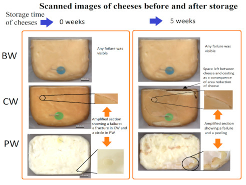Scanned images of cheeses before and after storage. Cheese coating at the beginning of the study and after 5 weeks of storage: Beeswax (BW), candelilla wax (CW), and paraffin wax (PW).