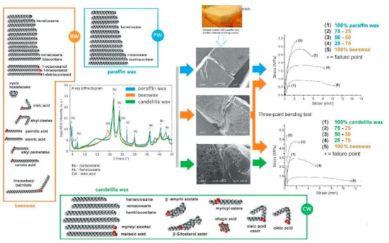 Composition linked to mechanical properties of beeswax (associated with orange box and arrows), paraffin wax (associated to blue) and candelilla wax (associated with green).