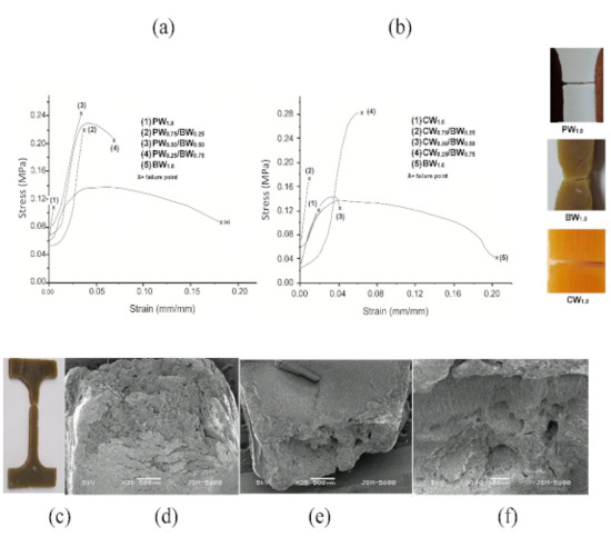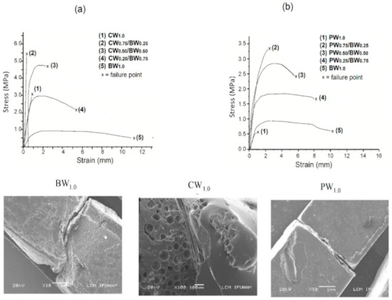 Flexural stress–strain curves of specimens made of two binary mixtures: (a) CWx/BW1−x, candelilla wax blended with increasing content of beeswax, (b) PWx/BW1 − x, (x = 1.0, 0.75, 0.50, 0.25, 0). Paraffin wax blended with increasing content of beeswax. SEM images showing fractures generated during flexural test of a specimen made of BW1.0, beeswax showing plastic deformation, CW1.0, candelilla wax showing elliptical holes and PW1.0, paraffin showing a typical brittle failure.