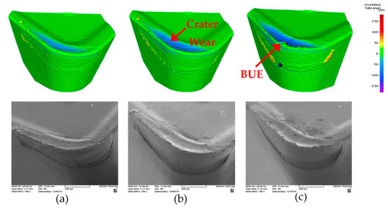 3D progressive wear data for uncoated tool highlighting progression of built up layer and crater wear after different length of cut: (a) 600 m; (b) 1200 m; (c) 1800 m.