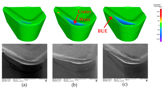 Progressive tool wear studies were conducted after every 600 m of cutting length using an SEM combined with 3D imaging by Alicona. The progression of tool wear for uncoated, AlTiN coated, and CrN coated tools is shown in Figure 3, Figure 4 and Figure 5, respectively. Two tool wear phenomena were observed: intensive adhesive interaction at the tool/chip interface and crater wear. Both the 3D and SEM images of the uncoated and AlTiN coated tools showed significant BUE formation and propagation of crater wear as cutting progressed. Figure 6 and Figure 7 show the formation of BUE and crater wear with respect to cutting length for uncoated, AlTiN coated, and CrN coated tools. Both the uncoated and the AlTiN coated tools show significant BUE formation compared to the CrN coated tool. The instability of the BUE formation is also evident by the strong fluctuation in peak volume compared with the previous passes (Figure 6). The lower BUE formation in the CrN coated tool decreased the possibility of tool edge chipping following its removal. The CrN coating also showed a reduction in the crater wear intensity and delay in the propagation of crater wear as machining progressed. Thus, lower BUE formation and delayed crater wear resulted in a much more uniform increase in tool wear, which, in turn, prevented rapid failure of the CrN coated tool. It is important to note here that the reduced crater wear values obtained for the uncoated tool (Figure 7) were due to the BUE covering the crater wear on the tool. This can be confirmed by the 3D and SEM images (Figure 3a,b and Figure 5a,b).