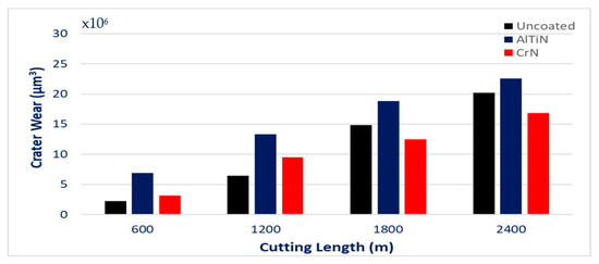 Crater wear volume progression vs. length of cut for uncoated, AlTiN and CrN coated tools considering the peaks below reference surface of the original tool.