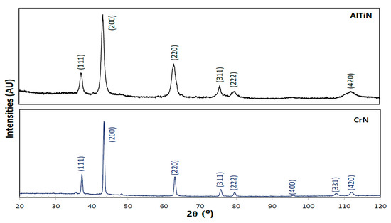 An XRD X-ray Diffraction System from Proto Manufacturing Limited (LaSalle, ON, Canada) with Cu-Kα (1.544 Å) radiation was used to determine the crystal structure and preferred orientation of the CrN and AlTiN coatings. Residual stresses were measured via a sin2 ψ technique with a LXRD Stress Analyzer from Proto Manufacturing. These measurements were performed with a 1.0 mm round aperture in (422) and (200) planes identified at 2θ angles of 130° and 80° for CrN and AlTiN coatings, respectively. A Gaussian function was used to fit the diffraction peaks.