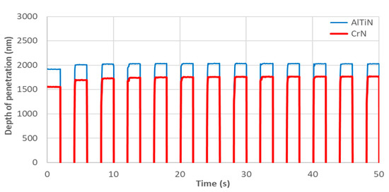 First 50 s depth of penetration obtained from nanoimpact testing at a load of 20 mN for AlTiN and CrN coatings.