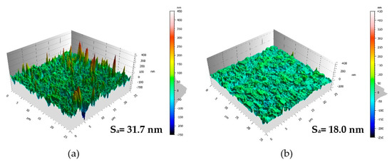 Atomic force microscope (AFM) images of surface topography of the coatings with arithmetic mean height (Sa) values: (a) AlTiN; (b) CrN.