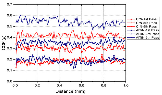 Evolution of coefficient of friction at different passes during repetitive wear test at 0.75 N for AlTiN and CrN coatings.