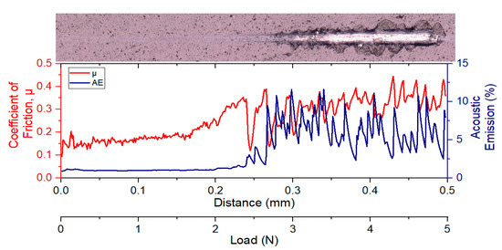 Optical images of the ramped load scratch test track with coefficient of friction and acoustic emission data for the CrN coating.