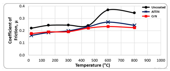 Coefficient of friction vs. temperature data for uncoated, AlTiN and CrN coated tools obtained from high temperature/heavy load tribometer.