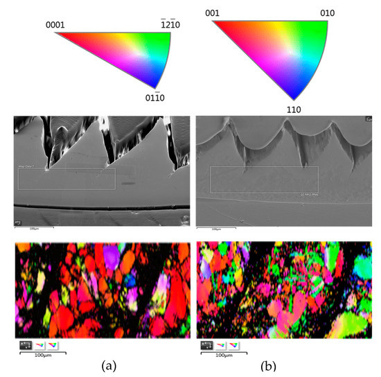 EBSD orientation, chip cross sections and phase map of chip cross sections: (a) AlTiN; (b) CrN.