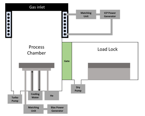 The ALE process was performed in a BMR HiEtch ICP etch system [17] (BMR Technology, New Jersey, NJ, USA) in which the chuck temperature was set to 5 °C using a helium backside cooling system and the chamber was evacuated using a turbo pump. A detailed system diagram is shown in Figure 1.
