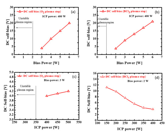 DC self-bias under varying bias powers at the (a) O2 and (b) BCl3 plasma steps, and under varying ICP powers at the (c) O2 and (d) BCl3 plasma steps.