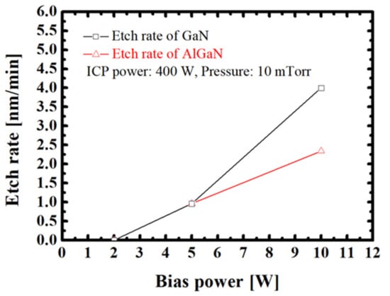 As mentioned previously, the self-limiting behavior of ALE must be realized to ensure a high linearity between the etching depth and the number of cycles. Therefore, the etch rates of GaN and AlGaN when using BCl3 plasma were investigated under a fixed ICP power of 400 W and varying bias power, as shown in Figure 4.