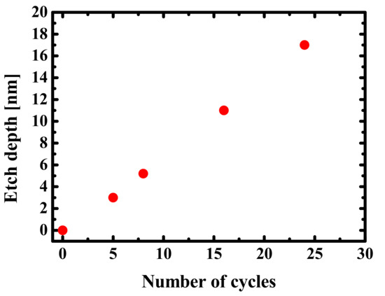 A high linearity was noted between the etch depth and number of cycles in the ALE, indicating that the etch depth could be controlled in the digital etching technique, as shown in Figure 5.