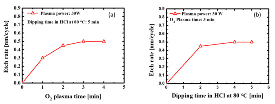 To examine the effect of the O2 plasma time, several O2 plasma times were considered for a fixed HCl dipping time. As shown in Figure 6, the etch rate per cycle increased as the O2 plasma time increased to 3 min. After 3 min, the etch rate remained constant. Under a fixed plasma oxidation time of 3 min and varying HCl dipping times, the etch rate increased as the HCl dipping time increased to 4 min and then stabilized.