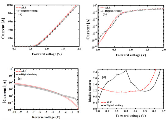 Figure 8 presents the I–V characteristics of the fabricated diodes and the ideality factors determined from the electrical measurements [20,21]. The ideality factor in the low forward bias region is an indicator for the trap-assisted recombination. As shown in Figure 8b, the slope of the forward bias region was not uniform for the digital etching case, which resulted in non-uniform ideality factor behavior in Figure 8d. On the other hand, the ALE case exhibited more uniform and lower ideality factor behavior at the low bias region. Therefore, it is suggested that the plasma-induced damage caused by the ALE process is less than that caused by the digital etching process. The increase in the ideality factor at the high forward bias region in Figure 8d is due to the fact that the diode current does not increase exponentially with the applied voltage [22,23]. The ideality factor determined at applied voltages of 0.1 to 0.3 V was ~1.1 and 1.8–2.5 for the diodes fabricated using the ALE and digital etching, respectively. The zero-bias barrier heights were 0.81 and 0.72 eV for the diodes fabricated using the ALE and digital etching, respectively, and a lower reverse current of 4.8 nA at −2 V occurred at the ALE diodes. These results indicated that the ALE incurred lower etching damage than the digital etching, resulting in better electrical characteristics.