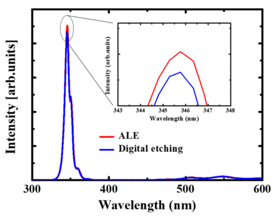 To further investigate the etching damage, the PL intensity was measured at the etching depth of ~5 nm. As shown in Figure 9, a lower near-band-edge PL intensity was observed in the samples etched using the digital etching than those in the samples etched using the ALE. This finding indicated that fewer non-radiative recombination centers such as N vacancies were present in the sample etched using the ALE [24,25,26].